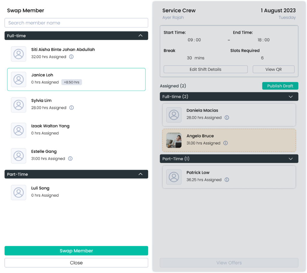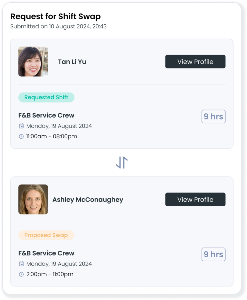 Employees can take ownership and seek out colleagues to initiate shift swaps through the Inside app, requiring only your approval to finalise the transaction.